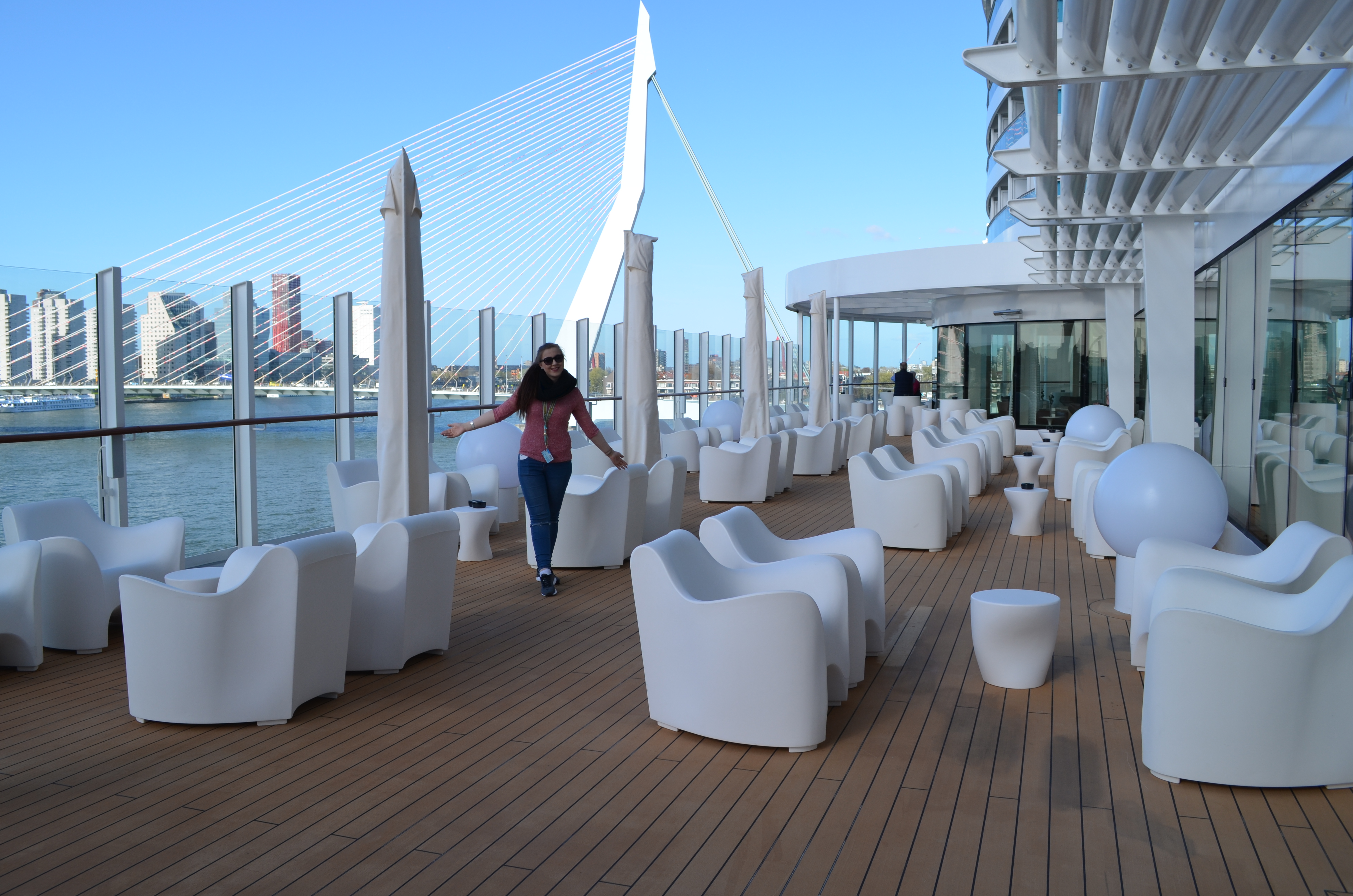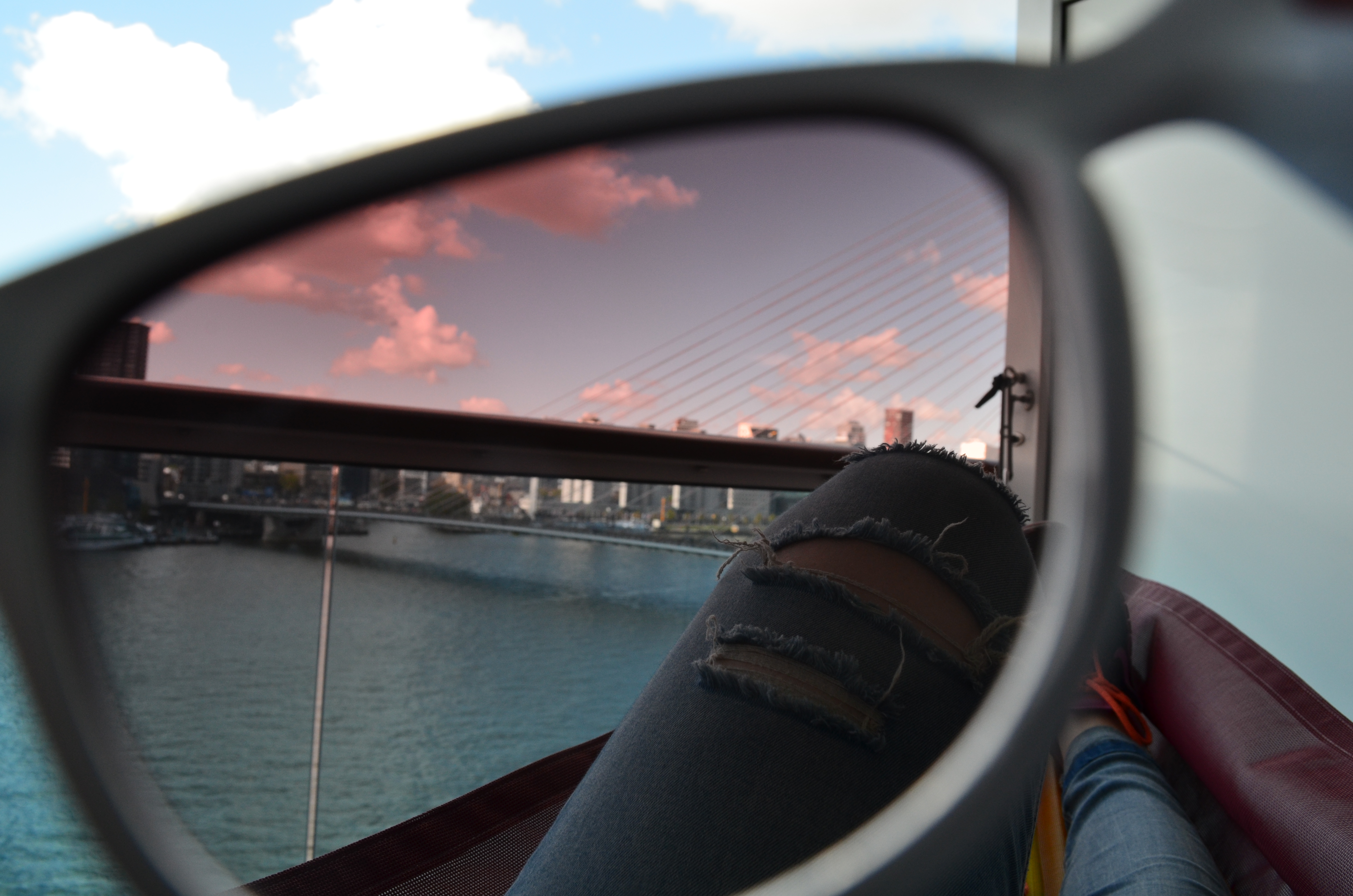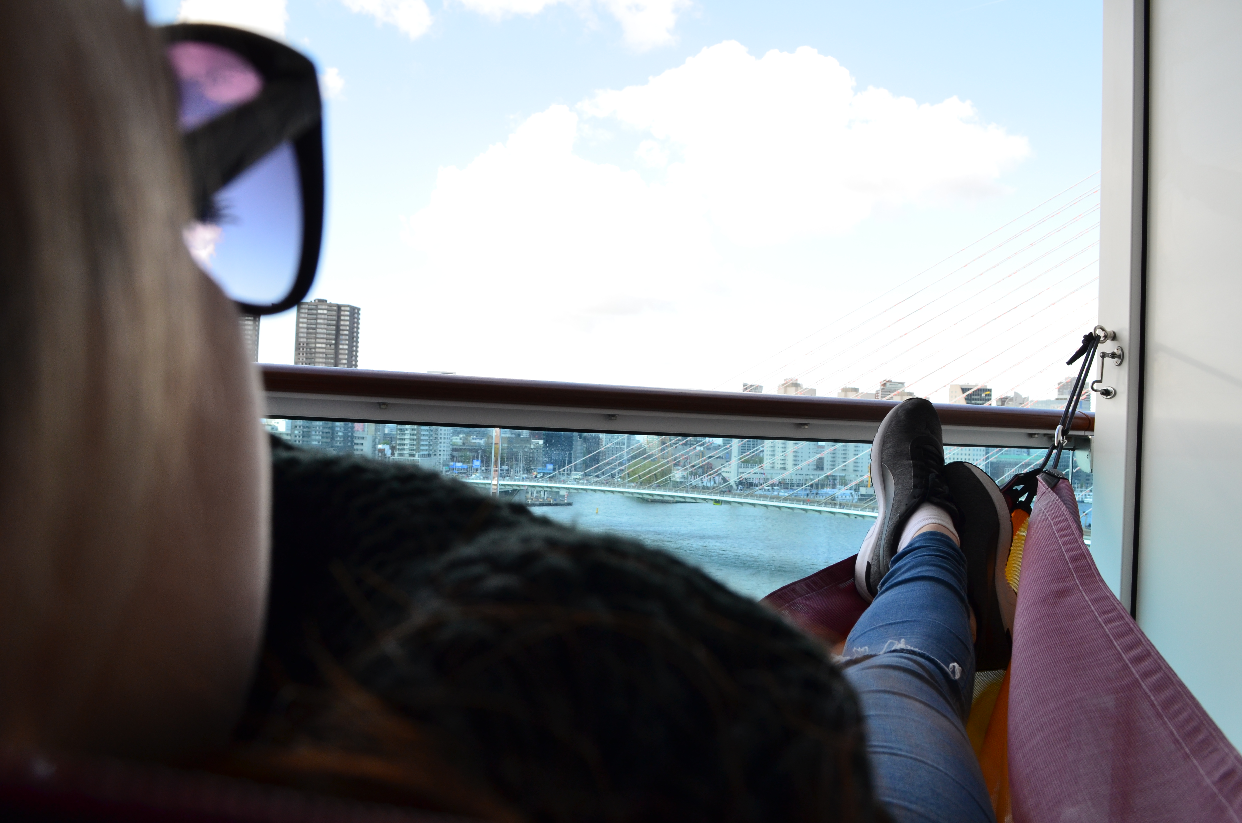 Jede Verandakabine ist mit einer Hängematte ausgestattet, die man bei Bedarf anbringen kann. Hier kann man im wahrsten Sinne des Wortes die Seele baumeln lassen und den Ausblick des Wilhelminapier und auf die hochmoderne Stadt Rotterdam genießen konnten.